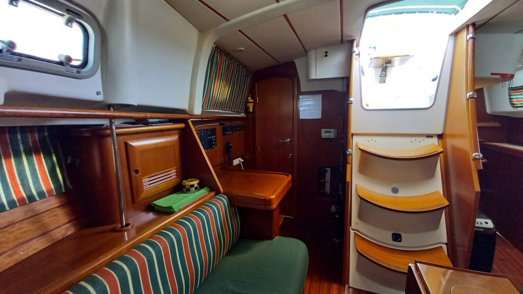 S/y CILLA to Oceanis 36 cc, bardzo wygodny jacht o długości 11m. Posiada dwuosobową kabinę dziobową, dwuosobową kabinę rufową oraz dwie koje w messie. Do tego w pełni wyposażona kuchnia oraz łazienka z toaletą.